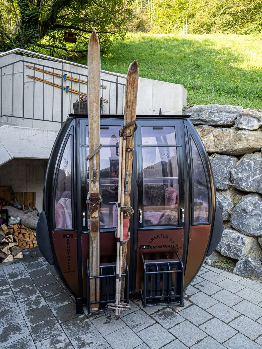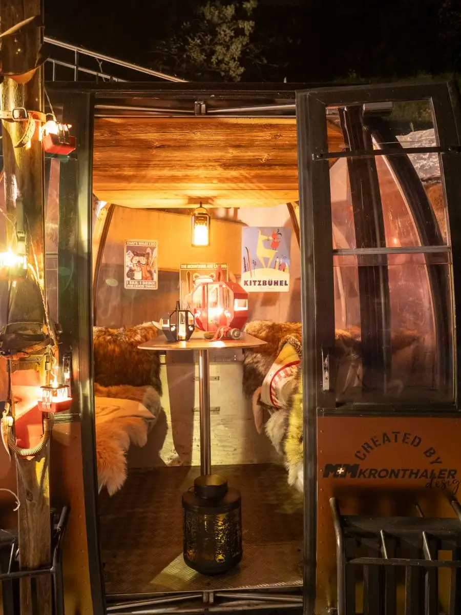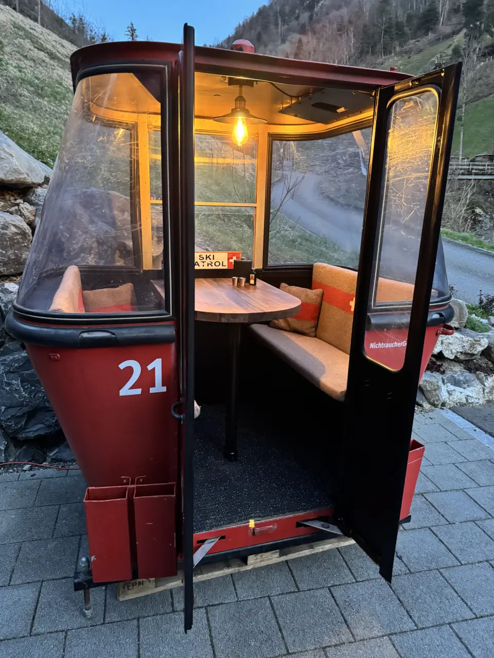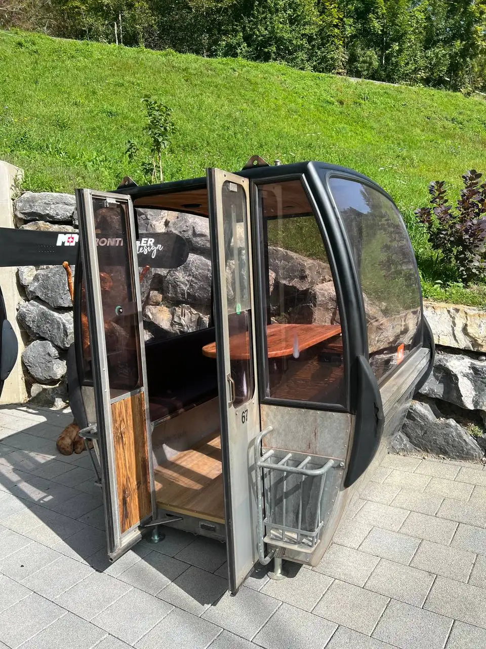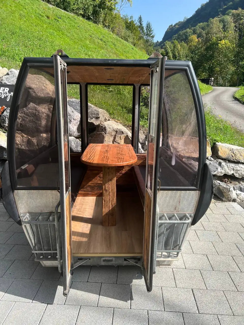 Alle unsere Gondeln sind vollständig ausgestattet, einschliesslich Altholzverkleidung, Stromanschluss und Beleuchtung. Darüber hinaus sind sogar Lautsprecher integriert, um für eine heimelige Atmosphäre zu sorgen.