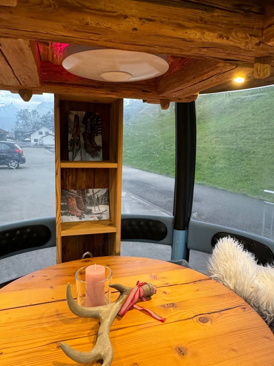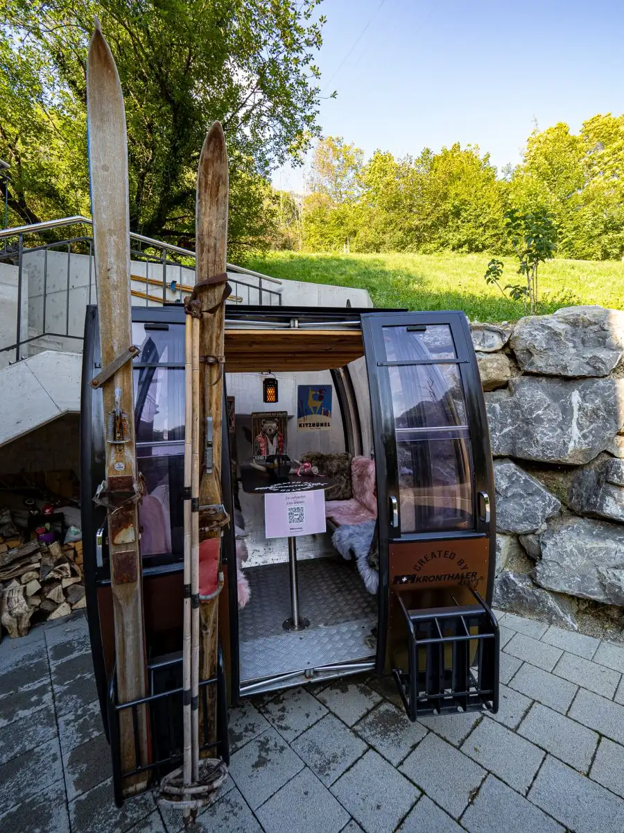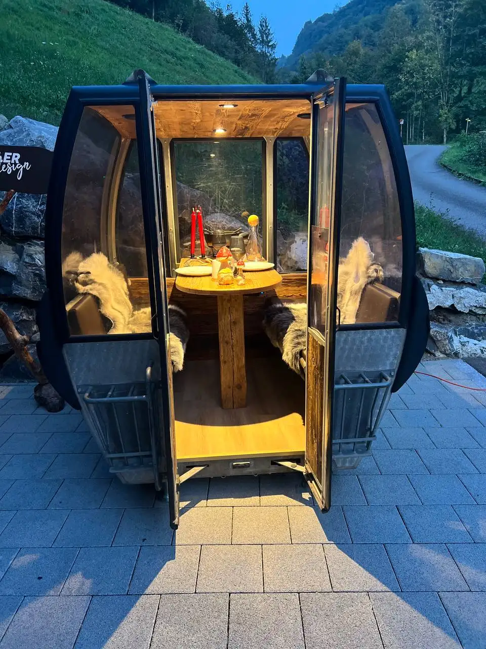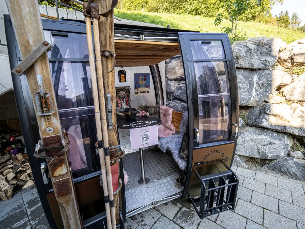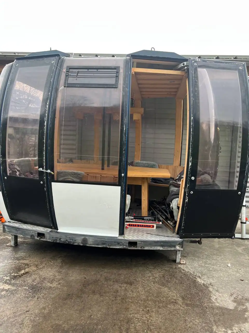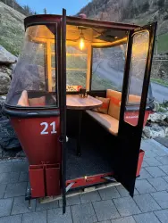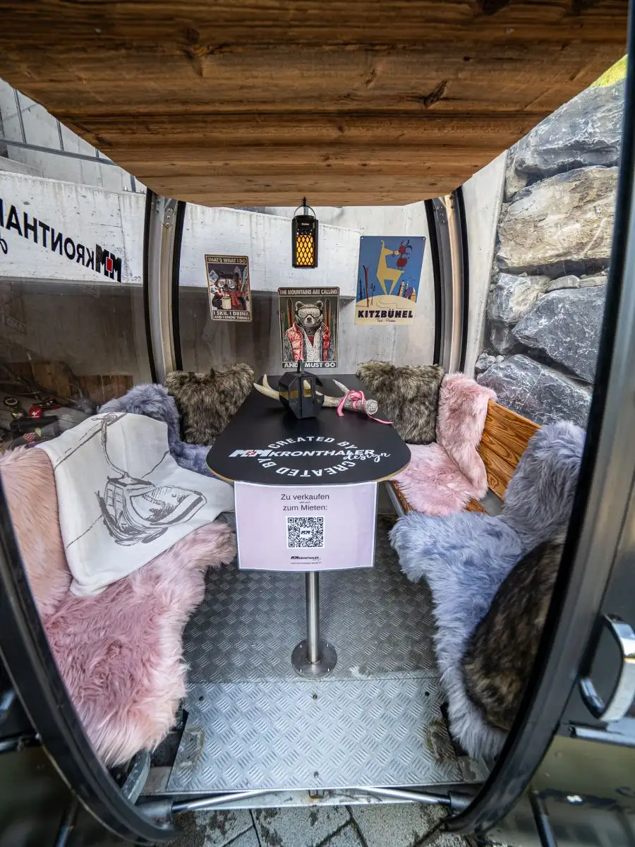 Alle unsere Gondeln sind vollständig ausgestattet, einschliesslich Altholzverkleidung, Stromanschluss und Beleuchtung. Darüber hinaus sind sogar Lautsprecher integriert, um für eine heimelige Atmosphäre zu sorgen.