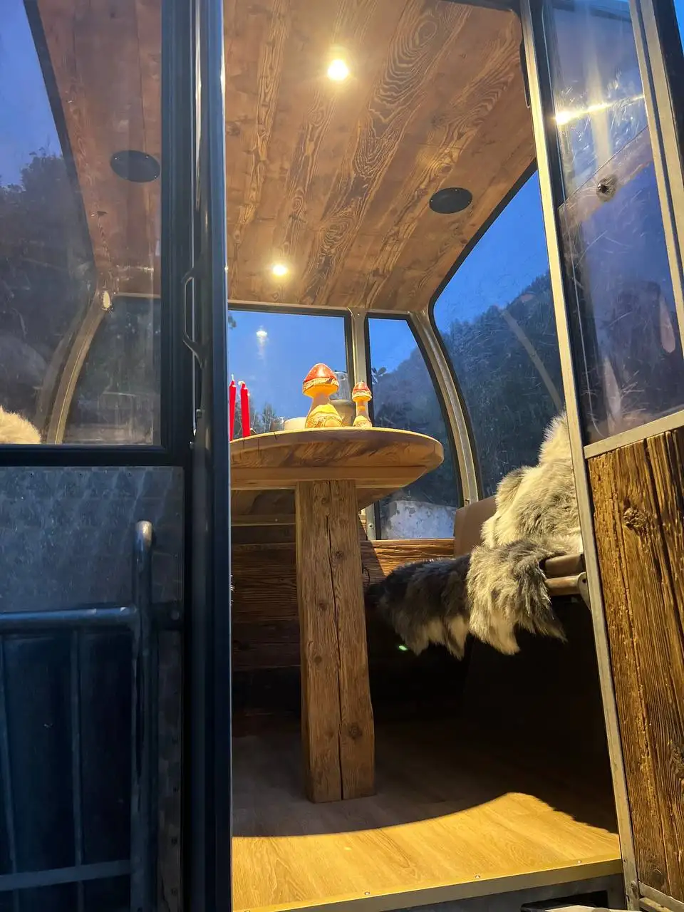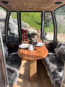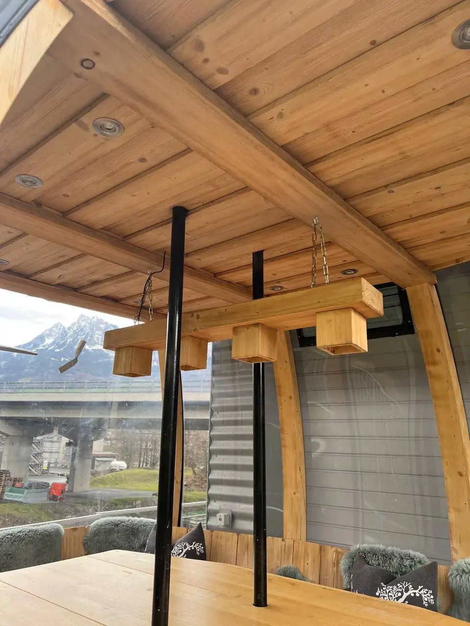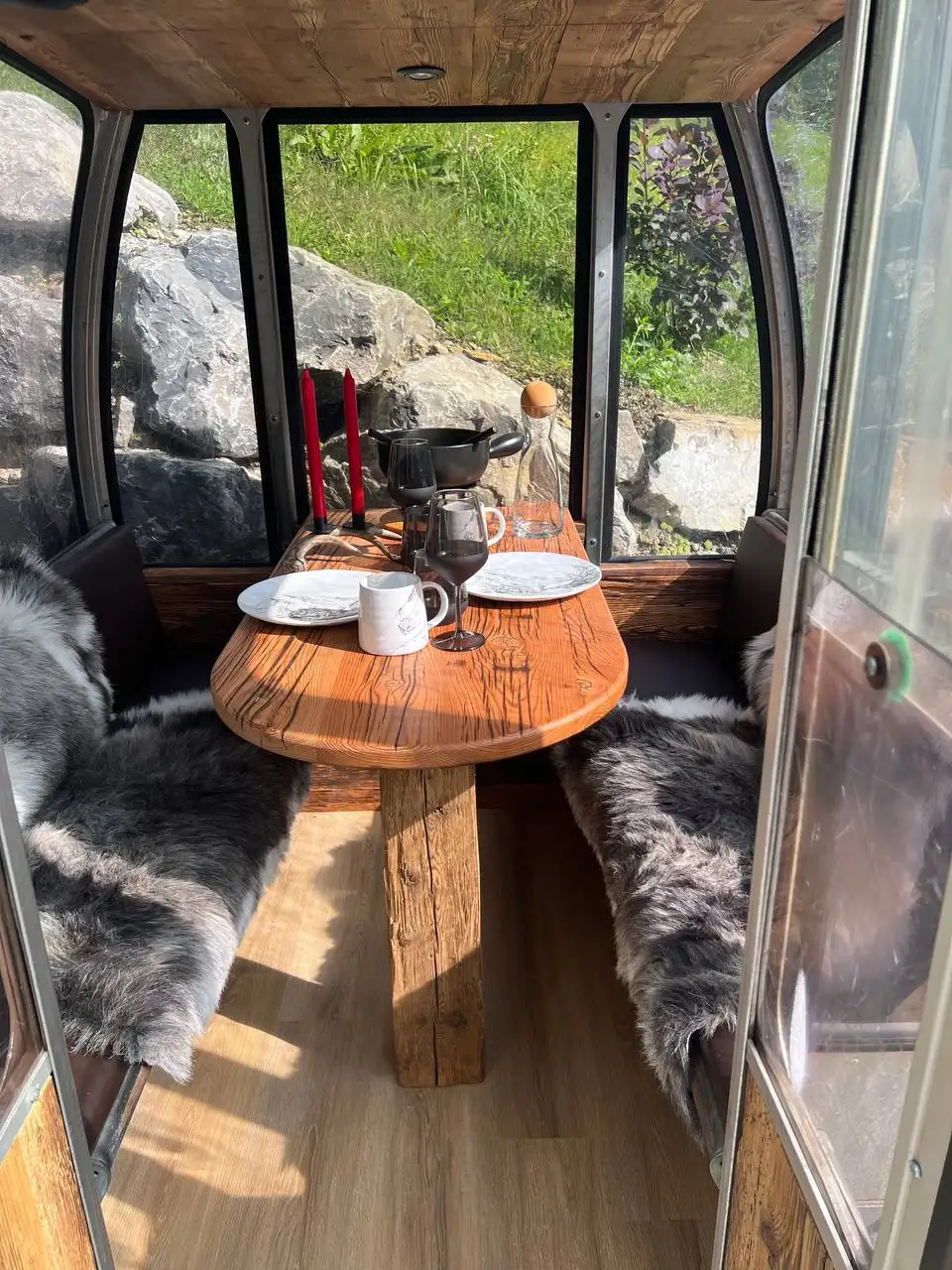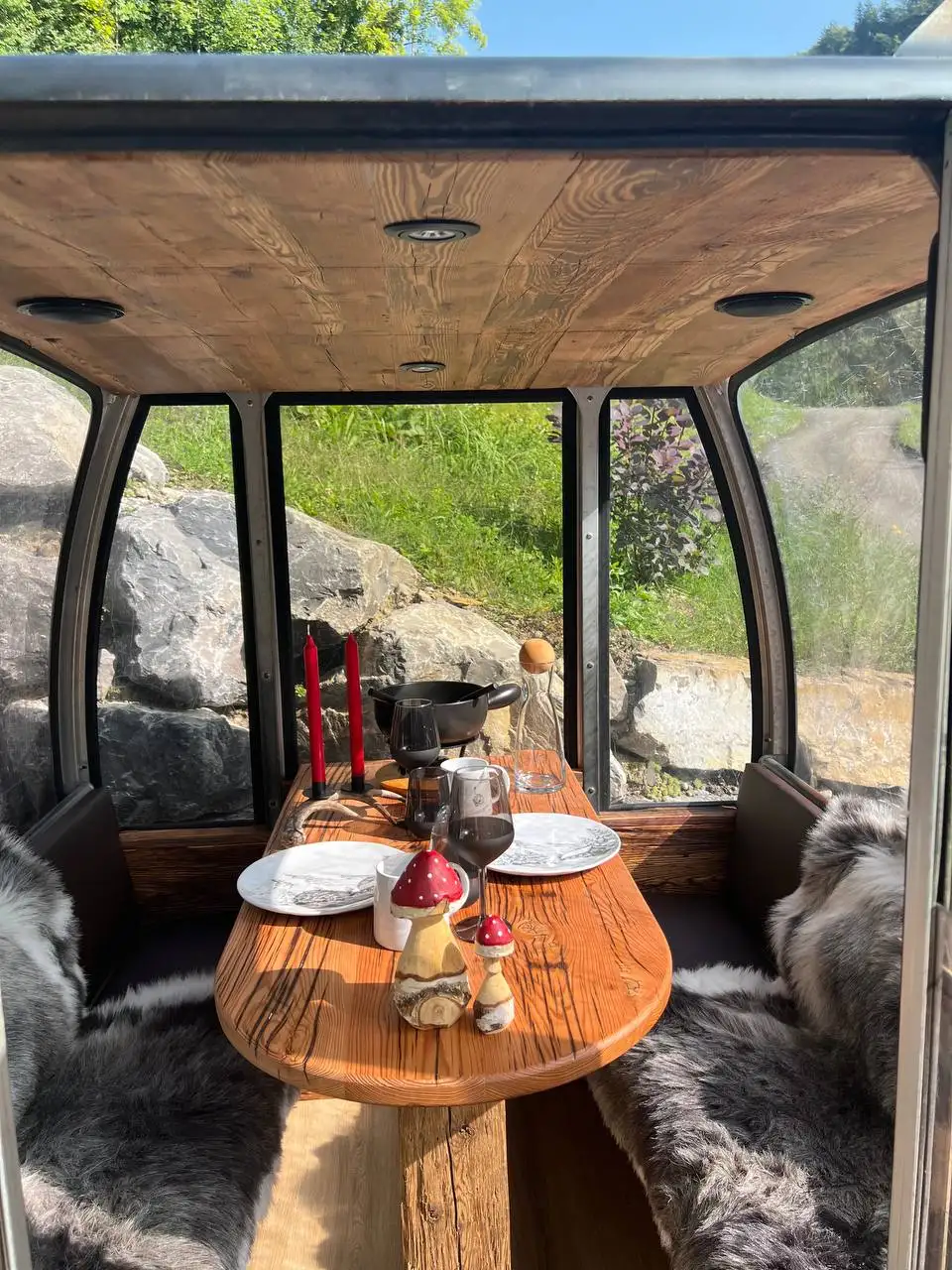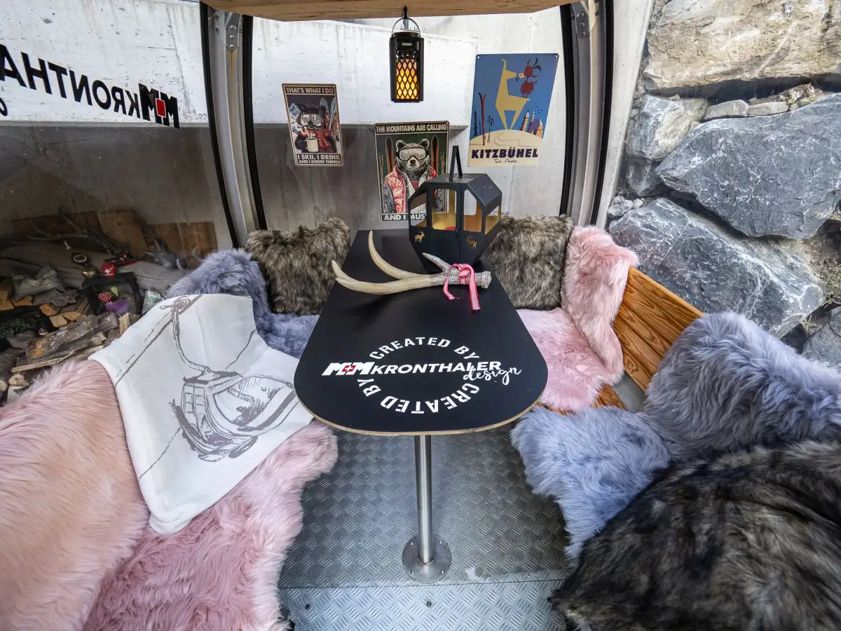 Alle unsere Gondeln sind vollständig ausgestattet, einschliesslich Altholzverkleidung, Stromanschluss und Beleuchtung. Darüber hinaus sind sogar Lautsprecher integriert, um für eine heimelige Atmosphäre zu sorgen.
