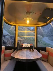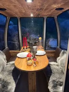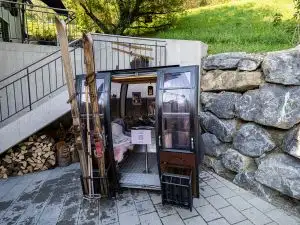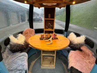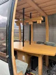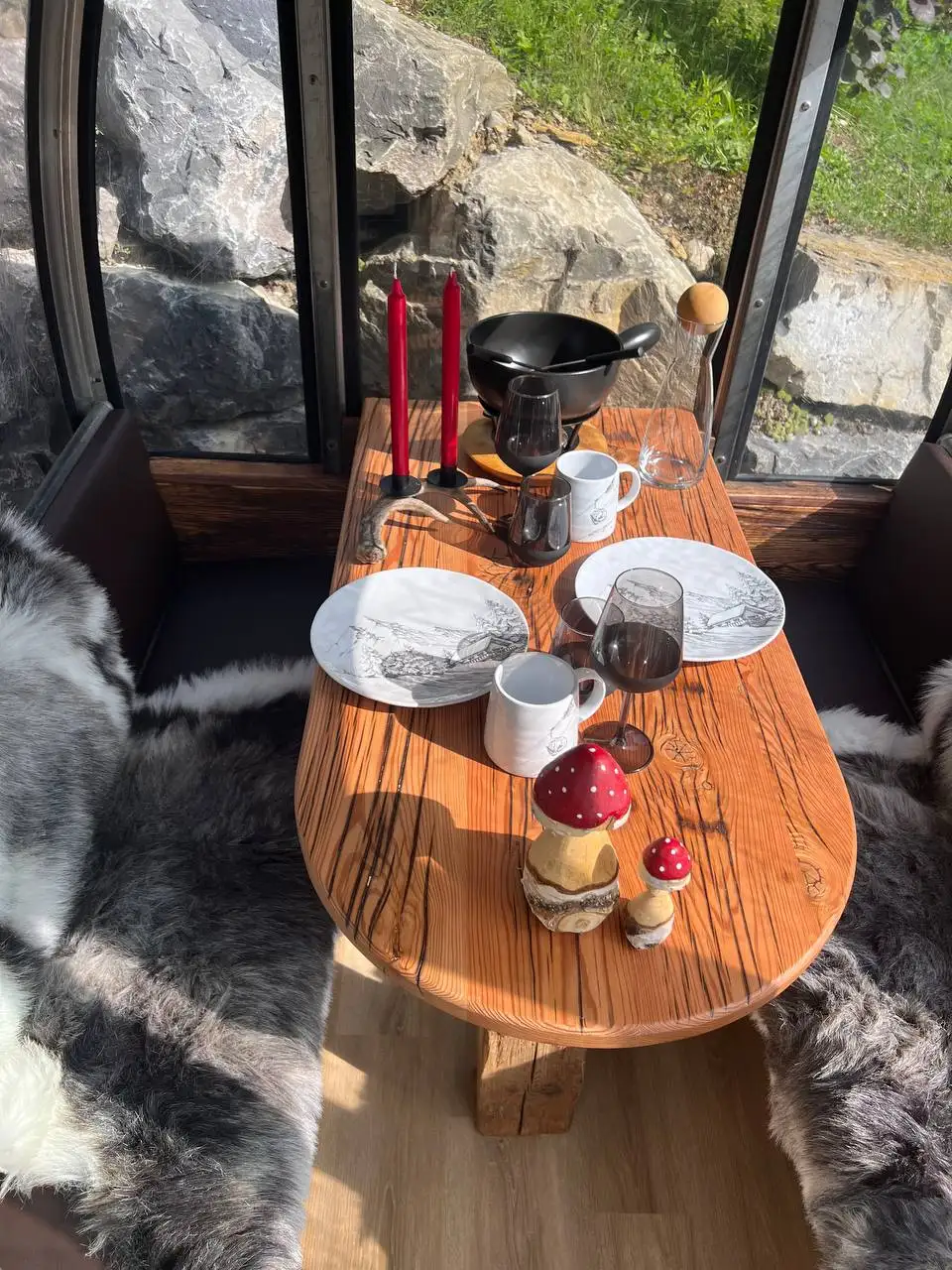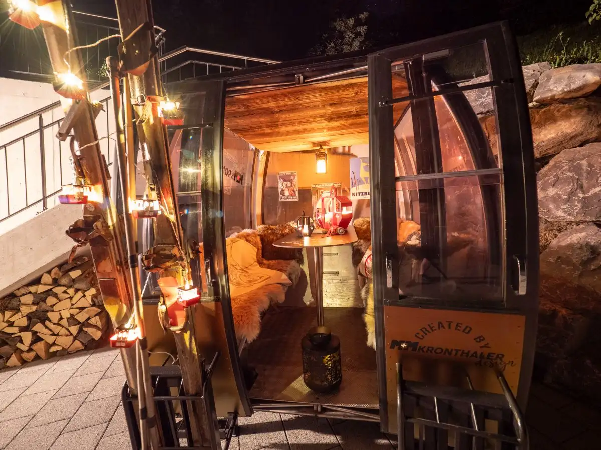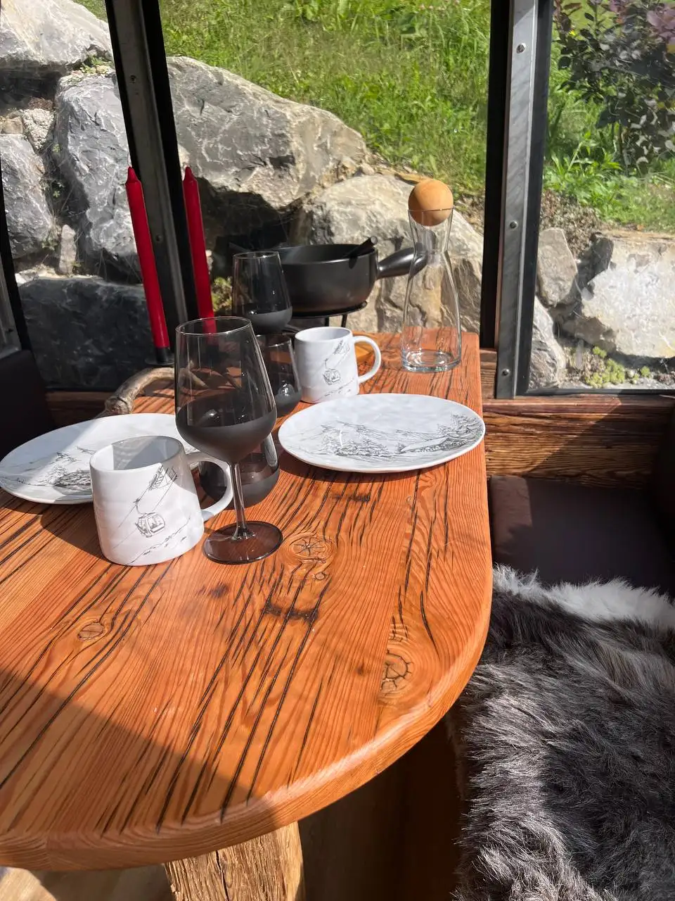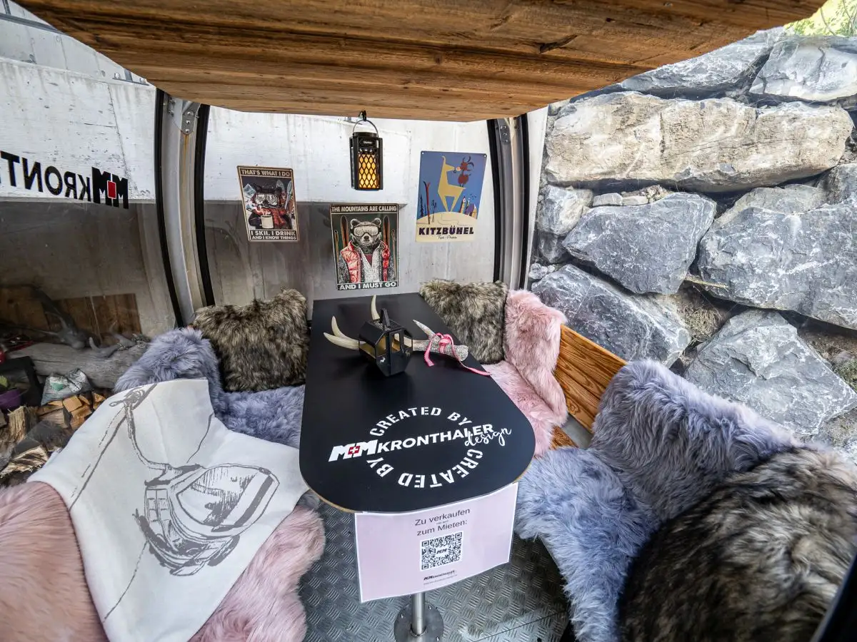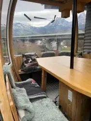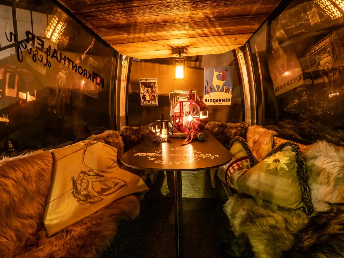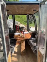 Alle unsere Gondeln sind vollständig ausgestattet, einschliesslich Altholzverkleidung, Stromanschluss und Beleuchtung. Darüber hinaus sind sogar Lautsprecher integriert, um für eine heimelige Atmosphäre zu sorgen.